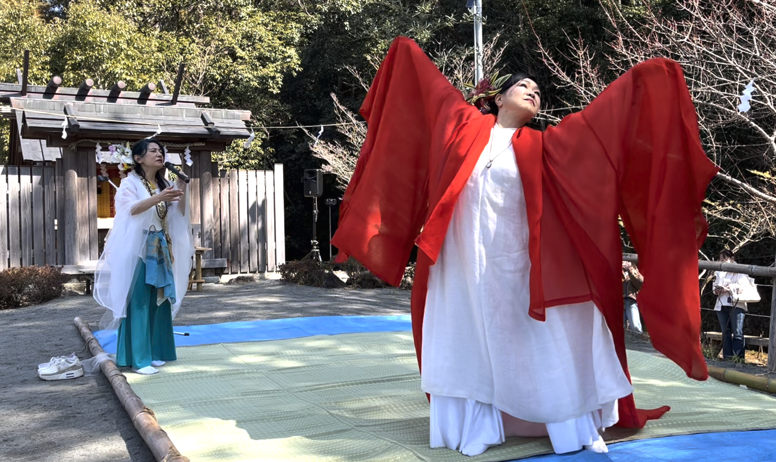 令和七年四月四日に秩父今宮神社の龍神祭にて、八大龍王神様を祀る龍神木前でうたとまいを奉納いたしました。弥衣さんのうたと朝子さんのまいは、その場にそよぐ風と一体となり、美しい同期を見せてくれました。